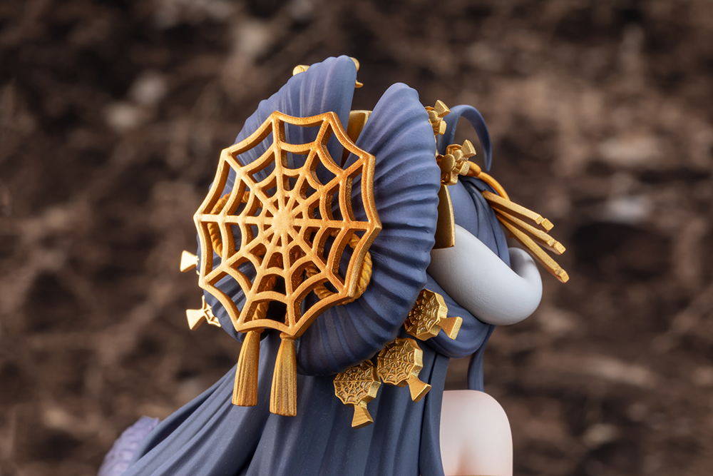 いつもの白いドレスと異なる黒の振袖には、金銀で描かれた蜘蛛の意匠が。大きく結い上げた髪の後ろにも、蜘蛛の巣の髪飾りが光ります。