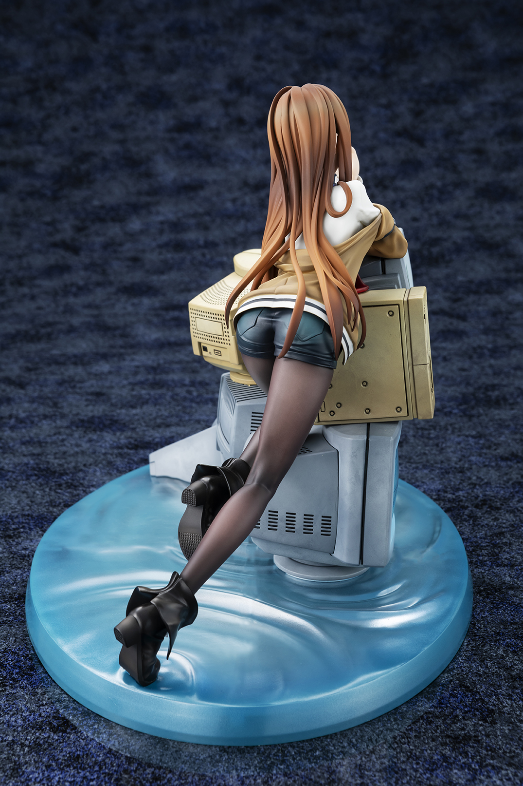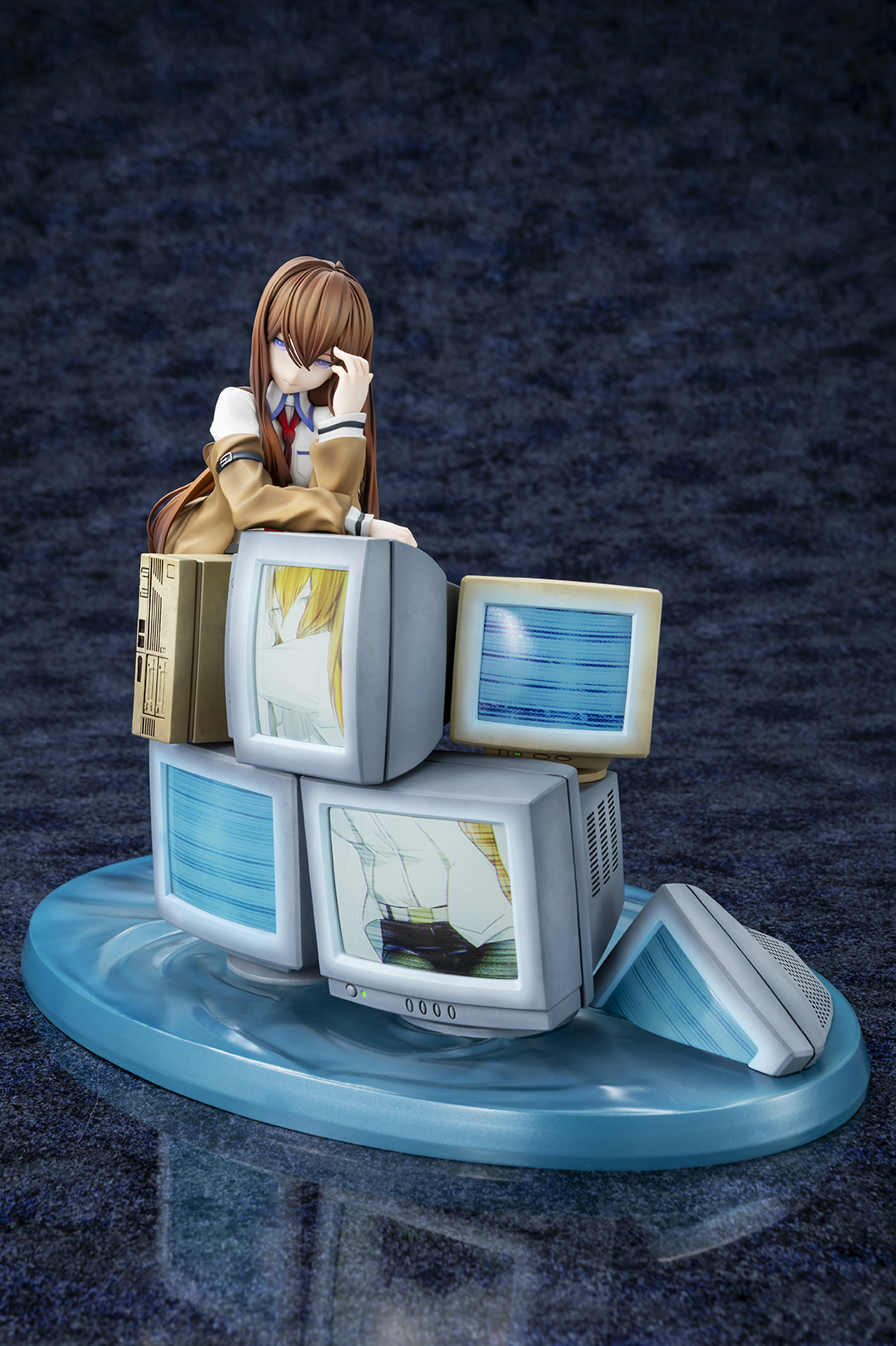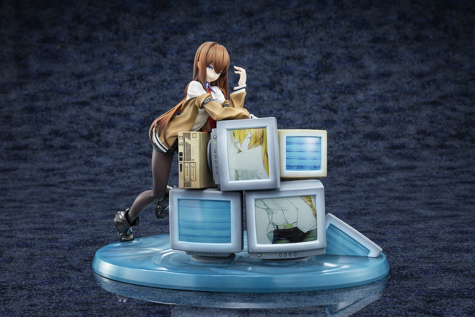 華奢なボディラインやどこか儚げな表情、しなやかな脚を包むタイツの質感までこだわりをもって再現。しなやかに体を預けた無数のCRTモニターには、“牧瀬紅莉栖”のデータをもつ人工知能アマデウスが映し出され、紅莉栖との対比によって虚ろな世界線を表現しています。