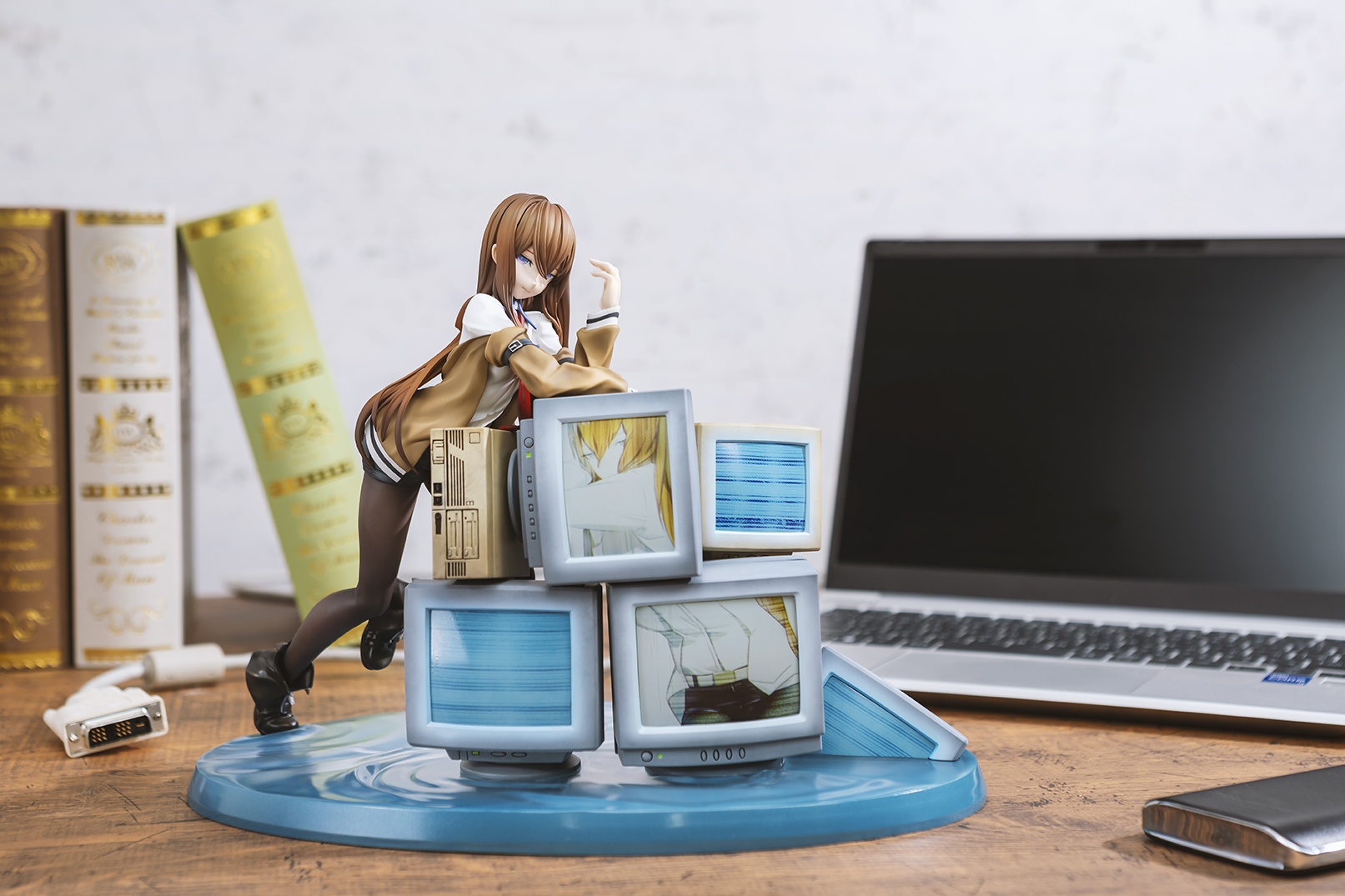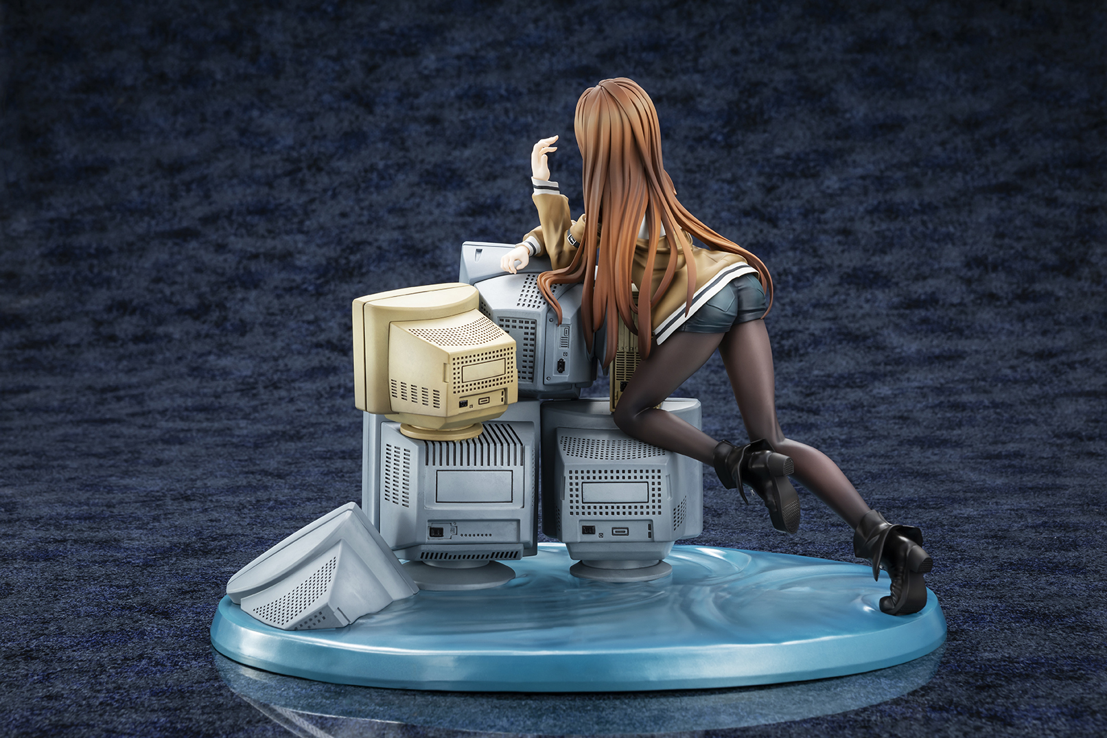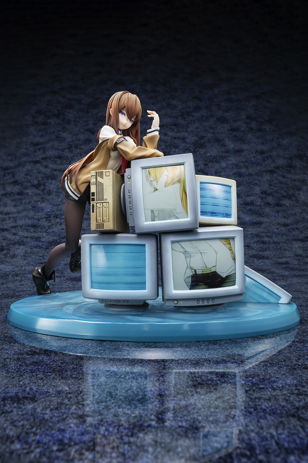 華奢なボディラインやどこか儚げな表情、しなやかな脚を包むタイツの質感までこだわりをもって再現。しなやかに体を預けた無数のCRTモニターには、“牧瀬紅莉栖”のデータをもつ人工知能アマデウスが映し出され、紅莉栖との対比によって虚ろな世界線を表現しています。